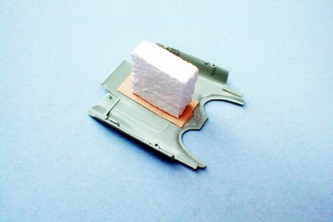 To make sure I could easily get to all the surface areas of each part, I cut pieces of styrofoam, thick enough to make sure the parts would be well above the cardboard surface, and used double-sided pieces of masking tape to mount them.
