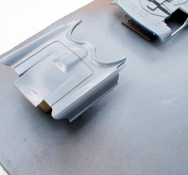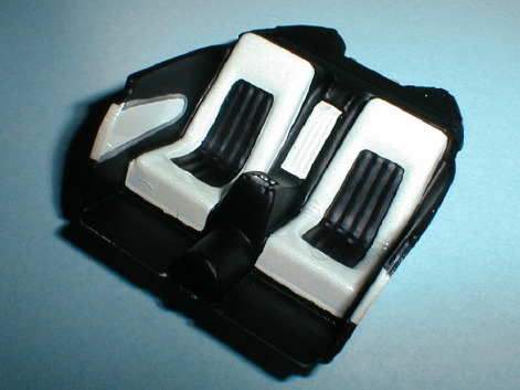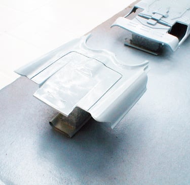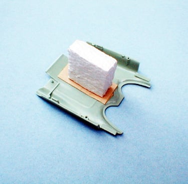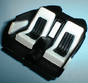 This technique came in handy because the cardboard acted like an artist’s palette throughout the painting process. I was able to hold it and turn it to various angles to make sure I had uniform coverage on all the parts. The only precaution I took was to make sure the parts were securely fastened down so they wouldn’t fall off. The two main interior parts were also included, because according to my research, part of the Futura’s upholstery was color-keyed to the exterior paint.