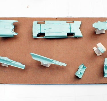 Because of the way the kit was engineered and the way it builds up, it wasn’t possible to pre-assemble the multi-piece body prior to painting. I was concerned about possible minor color differences between the individual body panels, so I decided to mount them all on a large sheet of cardboard so they could be painted simultaneously.