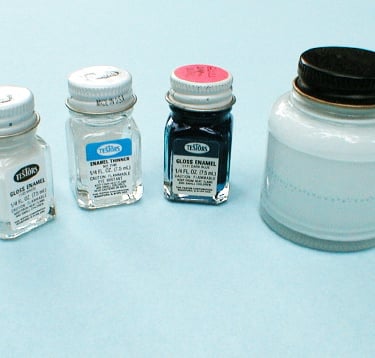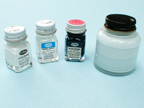 I also wanted to make sure I’d have enough for the multiple coats I anticipated applying, so I wound up using four small bottles of white, thinned with three small bottles of thinner. I added the blue by dipping just the tip of an old paint brush handle in the blue and stirring it in until I got the shade I wanted. Because this was the first time I had used thinned enamel like this in my airbrush, it took a bit of experimentation to get it right.