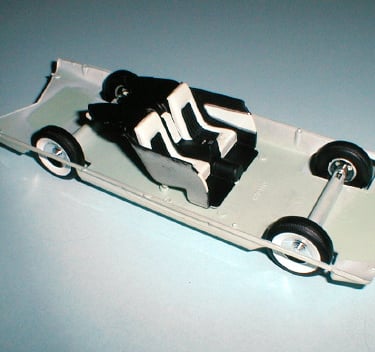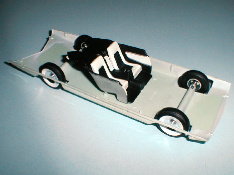 The wheels and tires are positioned onto heavy metal axles, which are then snapped into place in slots on the chassis/bellypan component. Then the rear interior section is attached to locating pins on the same assembly. Next comes the dashboard and steering wheel.