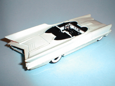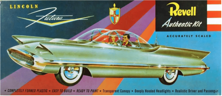 Of course, after it was assembled…no easy task for an eleven-year-old…it became just another toy in my stable of model cars. Consequently, it didn’t last very long. I gradually matured into a fledgling collector around 1960, but by then my original Futura was long gone. Some time in the mid-sixties I came across an out-of-the way hobby shop that had a large stock of older model kits, including several Futuras. I managed to score several for a buck apiece! I sold the excess to other collectors, probably for a (at that time) nice profit, but nothing to compare with what they would have brought in succeeding years. Prior to the re-release, a mint Futura kit would bring several hundred dollars, on those rare occasions when one would be uncovered.