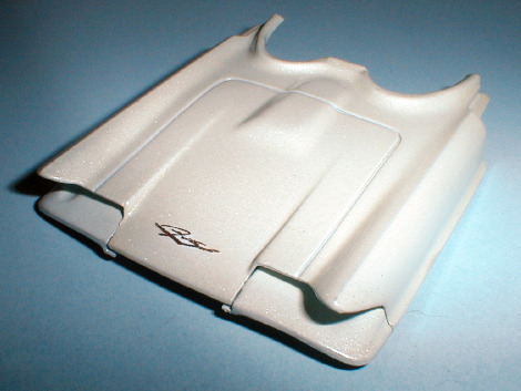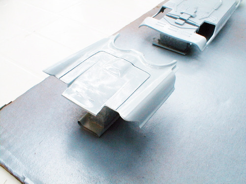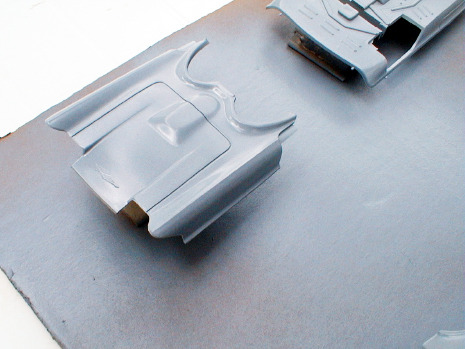 The taillights were painted and installed in the fenders, the rear fender scoops were detailed with flat black, and the rear fender assemblies were mounted to the trunk panel.